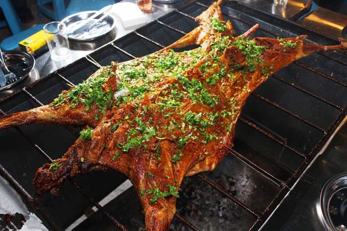 烤全羊是目前肉制品饮食中最健康最环保最绿色的美食了,烤全羊外表金黄油亮,外部肉焦黄发脆,内部肉绵软鲜嫩,羊肉味清香扑鼻,颇为适口,别具一格。