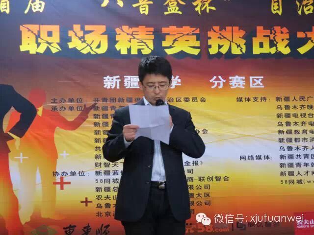 新疆广电网络股份有限公司行政部刘少辉助理、北京澳际教育咨询有限公司新疆分公司唐乐总经理、乌鲁木齐面对面网络有限公司(新疆人才网)陈雪刚总经理、乌鲁木齐蚂蚁梦想网络有限公司赵宏亮总经理、新疆蓝伽瑜伽文化有限公司屈高静女士、乌鲁木齐晚报记者魏静霞、掌上乌鲁木齐象牙塔运营部总监吕生亮,35名参赛选手及100余名学生观众参加活动。