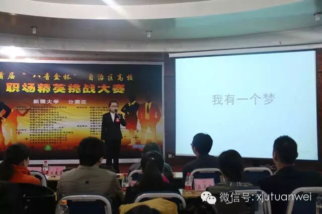 2014年11月20日(周四)16:00(京时),首届“八音盒杯”自治区高校职场精英挑战大赛我校决赛在校本部文科楼201报告厅举行。新疆青年就业服务中心刘春雷主任、新疆青年就业服务中心人力资源部唐祺部长、新疆八音和投资有限公司王宗华副总经理、新疆蓝伽瑜伽文化有限公司张长永总经理、校党委学工部副部长加拉力丁·比拉力老师、校团委副书记彭亮老师、校团委副书记韩涛老师担任评委。