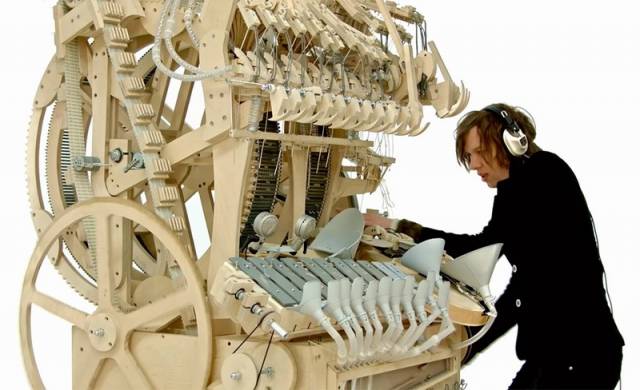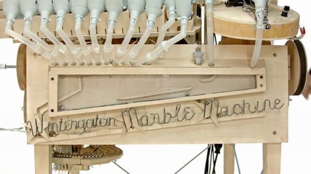 这台超大的木制音乐盒,由3000个零件所组成(漏斗、滑轮、齿轮、塑料管子等),它能发出许多不同的声音,不仅有铁琴当主旋律,甚至还自带鼓手和Bass吉他。最特别的是,所有的音乐并非出自人工之手,而是由2000颗弹珠自动敲打出来的。
