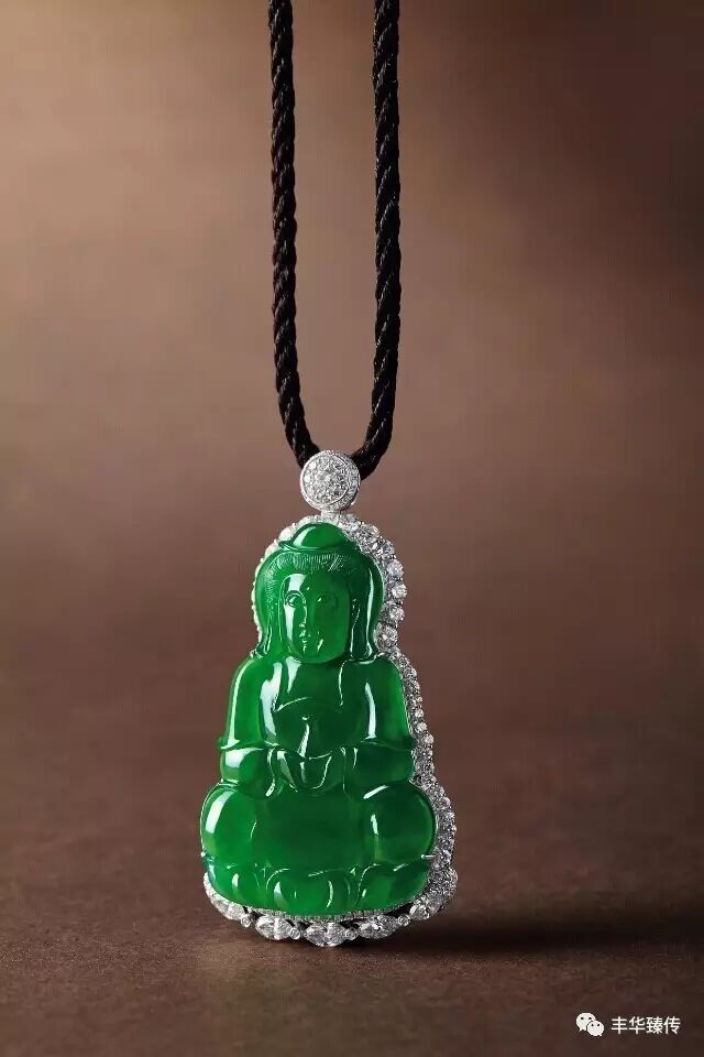 另有一条天然满绿翡翠蛋面配钻石吊坠项链,翡翠蛋面硕大丰厚、莹润饱满、水头清冽;另一件天然满绿翡翠「观音」吊坠,色正浓艳,端庄而大气,属翡翠观音之精品。