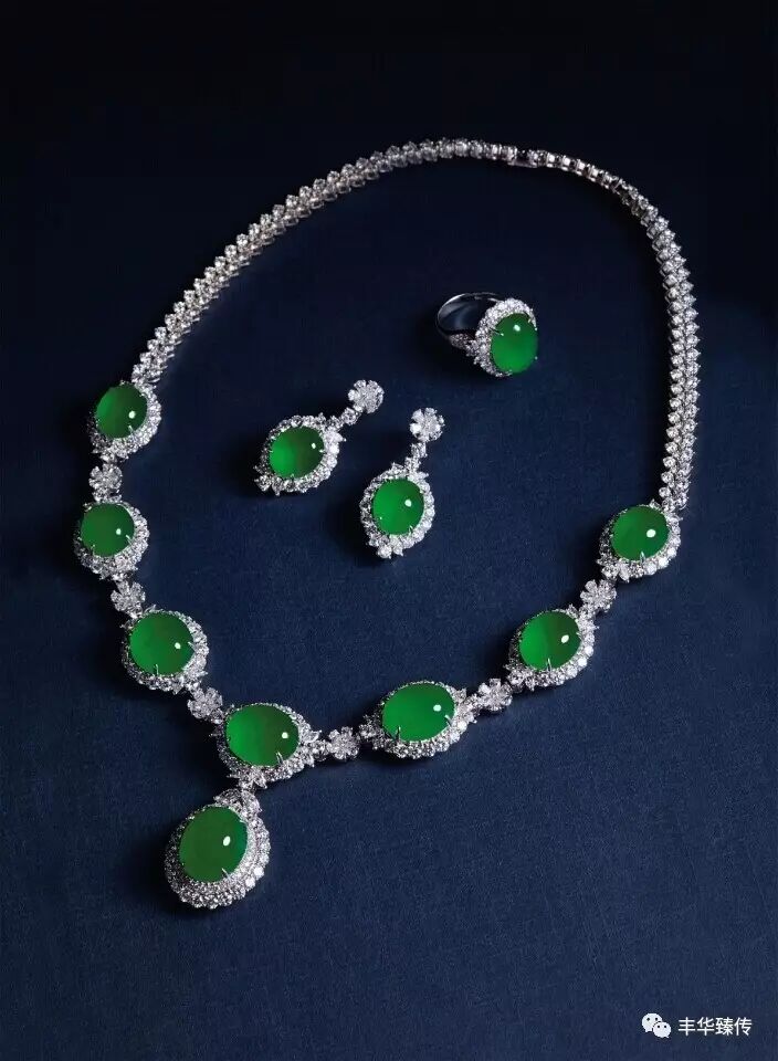 朱:好的。翡翠方面,多件瑰丽夺目的拍品将瞩目登场,包括华光满溢的天然满绿翡翠配钻石项链、耳环及戒指套装,种水俱佳,色泽娇艳欲滴,堪称为绝色佳品。