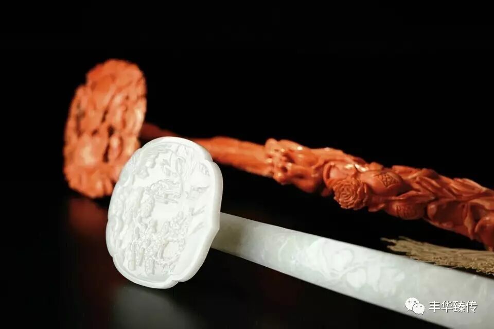 另有两柄乾隆时期的如意,分别以和田白玉和红珊瑚为材制作,雕刻工艺精湛,代表了乾隆一朝的工艺水准和审美意趣。