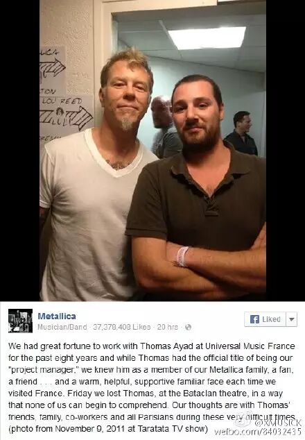 METALLICA乐队的一名项目经理Thomas Ayad也为能逃脱魔掌。就职于Universal Music法国的Ayad一直与METALLICA乐队合作。在Ayad的职场生涯中,还曾与Justin Bieber、滚石乐队的Keith Richards一起工作过。