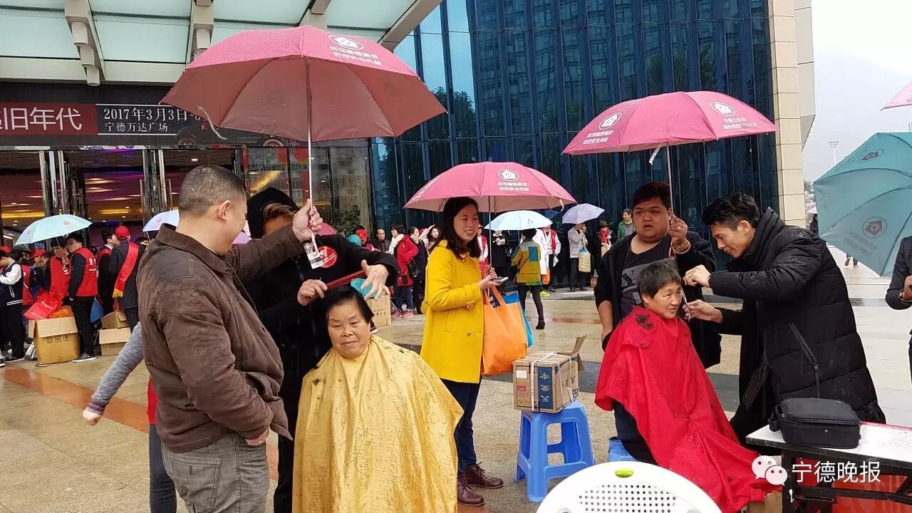 上午10时多,万达广场上的志愿活动正火热开展中,突然淅淅沥沥下起了小雨,许多服务咨询点不得不暂时撤离到广场里面,但还有几个志愿服务队伍“坚持不下火线”,在一个志愿理发点,志愿者们撑起雨伞,坚持为几名市民将头发理完。