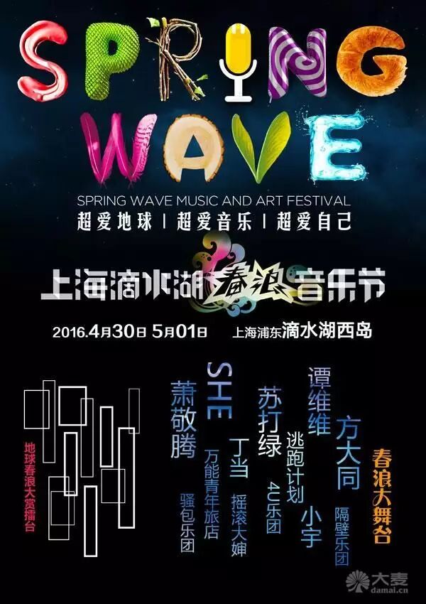 台湾地区著名的户外音乐活动“春浪音乐节”升级版2016强势登陆上海,4月30日、5月1日两天,滴水湖畔惊艳开启。S.H.E、苏打绿、萧敬腾、谭维维、方大同、逃跑计划、丁当等十三组华语流行歌手及乐队逐一登场,在具有3个八万人体育场大小的观众席内与数万观众一起狂欢!