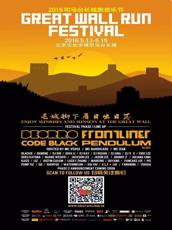 长城跑是以正在跑步的人穿越长城为主视觉形像,融合音乐节的音乐理念与5公里路跑的跑步理念,举办地在中国长城中最美、最险的司马台长城和长城脚下的古北水镇,届时将邀请多位国际大牌艺人和数十位优秀的本土艺人加盟,为参与者打造前所未有的感官与试听体验。
