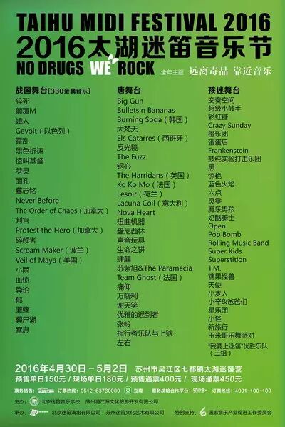 2016太湖迷笛音乐节回归江南大本营——苏州吴江区七都镇太湖迷笛营。现场将设唐、战国*330金属音乐、孩迷三个舞台,百余位海内外乐队及音乐人参演,在湖泊、河流、树林与青草遍布的800亩宽阔场地上,音乐狂欢和露营聚会将再度为江南水乡增添一抹盎然盛放的青春气息。