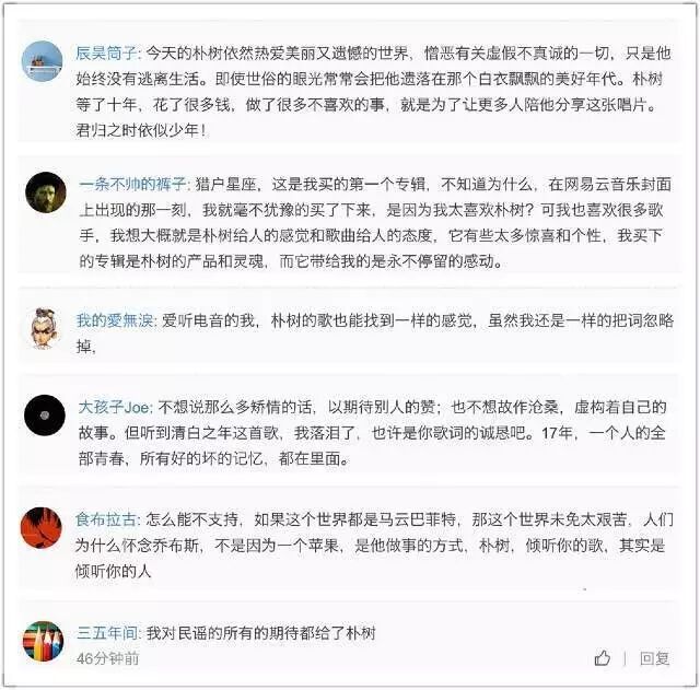 关于朴树的音乐,似乎总有很多“无关音乐”的内容。像是我们在网易云音乐上截取的粉丝留言,朴树的歌曲总是有着过去那段特定时期的符号烙印,每一首歌曲是多到快要载不动的平凡故事,它们都无关朴树歌曲好听还是不好听、质量如何、究竟是校园民谣、城市民谣、摇滚还是大流行歌曲的争辩。