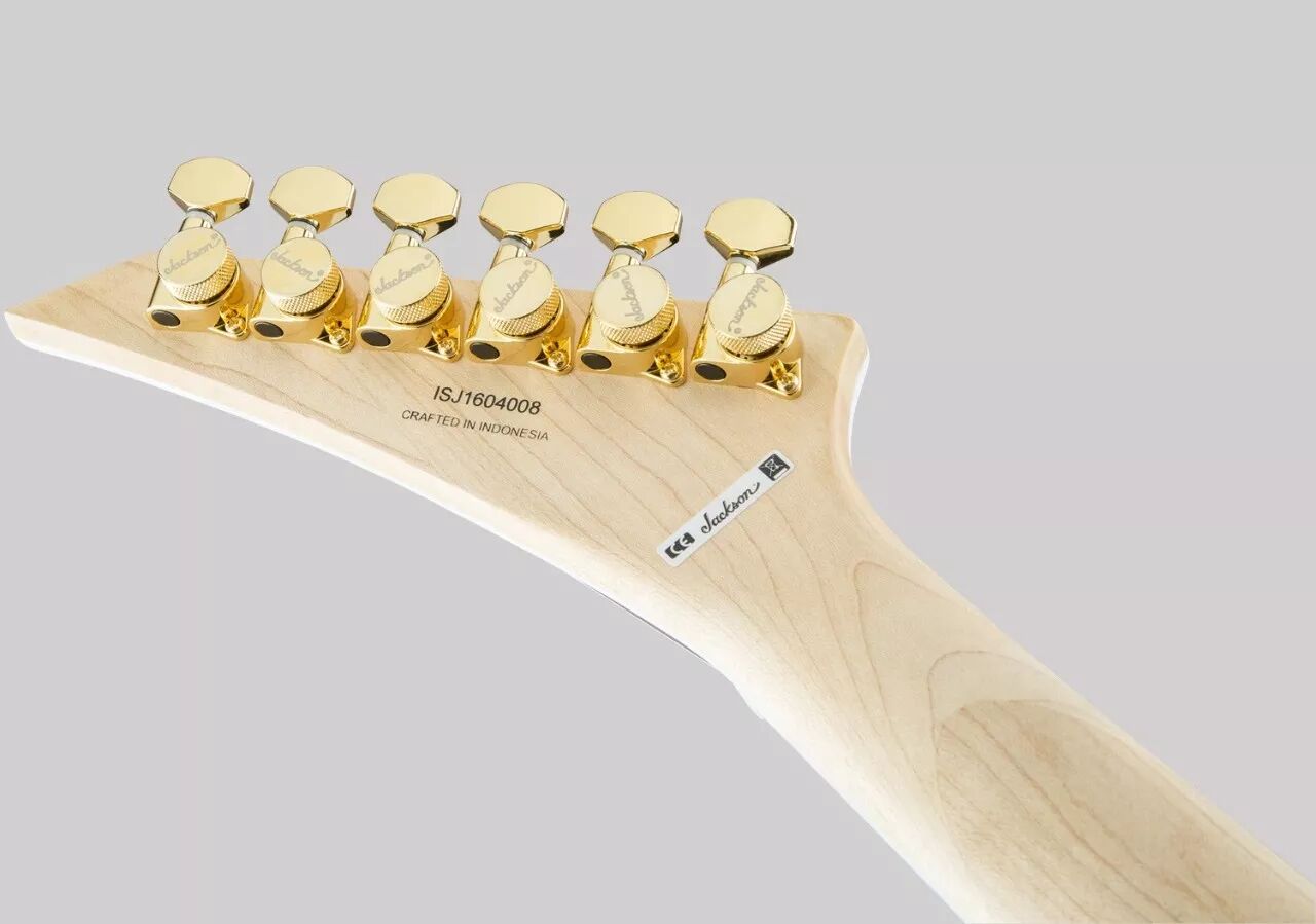 这款King V™ KVT配有桃花芯琴体,带有石墨加强结构的单片枫木穿体琴颈,琴颈经过手工过油(非上漆)处理;12’’-16’’混合弧度乌木指板,24品大号品丝,鲨眼方块型品记镶嵌;另配有单层白色琴体及琴颈包边,以及Jackson单排弦钮刀头琴头。