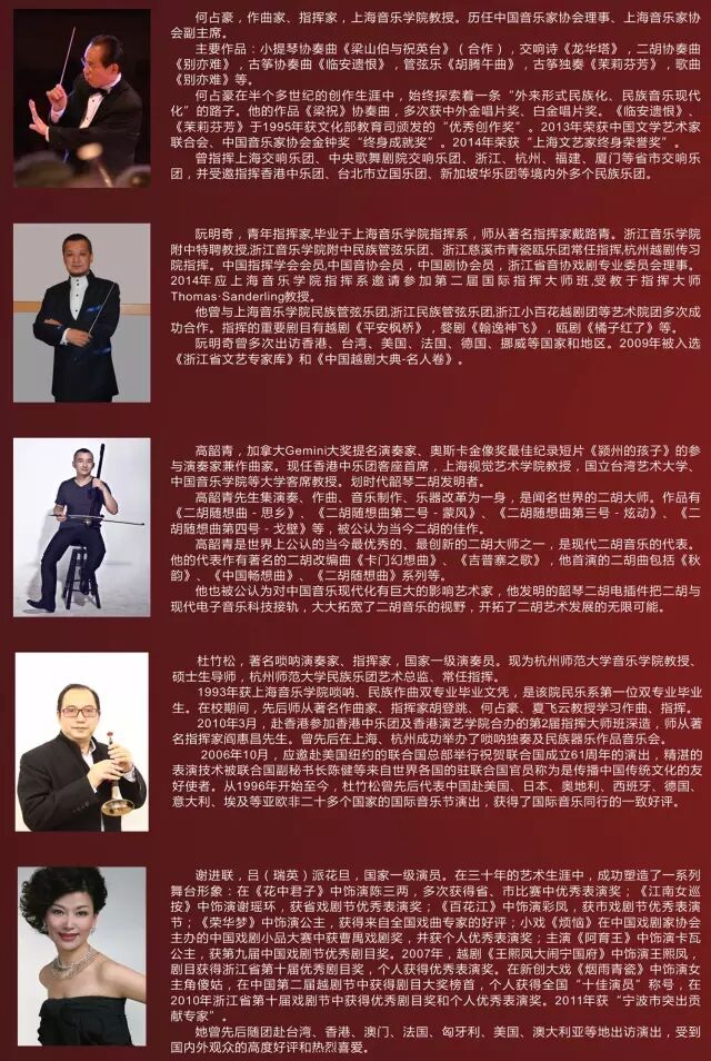 本次音乐会不仅集结了何占豪、高韶青、杜竹松三位顶级艺术家,在整个演出阵容中,更汇集了市演艺集团和慈溪青瓷瓯乐艺术团等全市最优秀的民乐演奏力量,众多国家一级演奏家组成强大演出阵容。