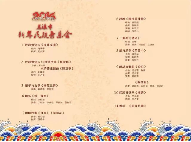 喜庆洋溢的《庆典序曲》一开场,浓浓的新年味就弥漫而开。演奏曲目中,既有刚刚参加完诺贝尔颁奖活动演出的古曲《梅花三弄》, 又有由地方戏曲改编创作而成的越剧《穆桂英挂帅》;既有耳熟能详、家喻户晓的经典曲目红楼梦主题曲《枉凝眉》、水浒传主题曲《好汉歌》和《梁祝》,又有近年来新创作的三重奏《涌动》、民族管弦乐《海路》、青瓷瓯乐《越·瓷风》、笙与乐队《风雪中》等,将是一场民族音乐的饕餮盛宴,带给观众全新的感受。