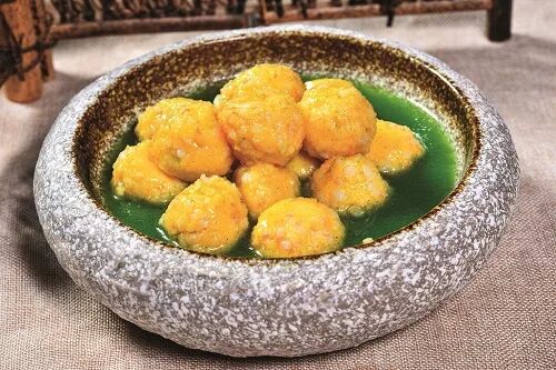 炉头 1.起锅烧水,将虾胶汆成虾丸,定形后,小火慢慢煨熟,捞出控水,放入盛器内。2.西芹汁入加盐3克、味素2克调味,勾芡让汁变浓稠,倒在虾丸上即可。