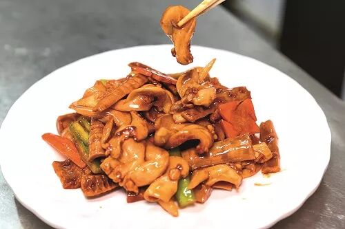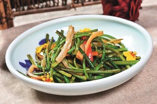 销售特色 用蒜薹搭配象拔蚌,原料食材高低结合,不仅做出低成本高毛利的菜品且又不失体面。