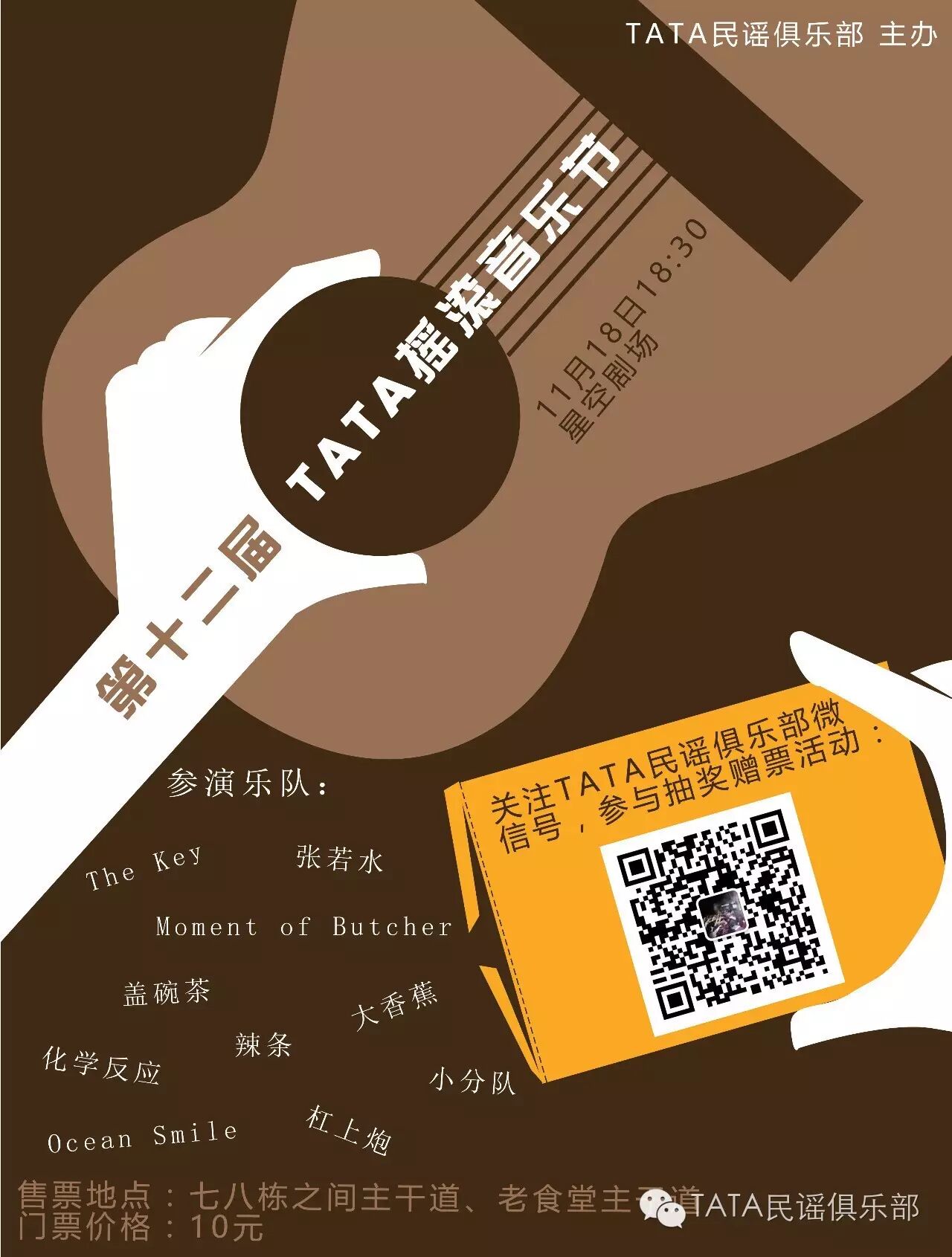 是的是的没错,大家期待已久的第十二届TATA摇滚音乐节即将在11月18号晚18:30准时与大家见面。跟以往音乐节不同的是,本次音乐节一共有十支乐队参与演出!整整十支,绝对能满足你躁动不安的灵魂和爱跳舞爱扭动的身体。不用去草莓也不用去迷笛,长达四小时不间断的摇滚音乐现场在成都文理学院也看得到,而且,只要十元!如此大规模的音乐节竟然只要十元的门票,绝对的物超所值!赶紧来吧,带上你那颗空虚的心加入这个大Party,度过大学时光中仅有的不眠之夜!