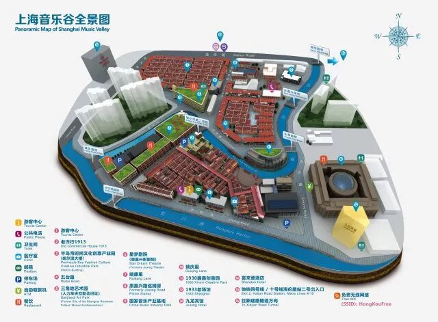 上海国家音乐产业基地地处虹口区中部功能区内,规划面积1平方公里,以海伦路、溧阳路、四平路、梧州路的围合区域为主体核心范围。片区内俞泾浦、虹口港、沙泾港相交蜿蜒环绕,河道全长1200多米,并保留8座具有百年历史的桥梁,是目前上海唯一保存完整水系格局的历史文化风貌地区。区域内至今还遗存有大量独具虹口特色的石库门建筑群,留存至今的建筑都有着很高的历史价值与人文内涵。