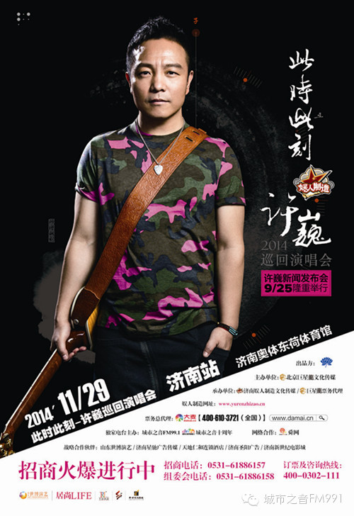 城市之音991十周年系列活动【许巍·此时此刻2014全球巡演济南站】即将于11月29日唱响济南奥体中心体育馆,许巍坦言"此时此刻"巡演和《此时此刻》专辑一样,将展现给大家他和全体乐队的共同作品,能给到乐队最大程度的发挥空间。正如演唱会海报的中国元素,从无到有晕染墨迹,从子时开始的时间点,形成一个不完整的圆弧,将表现出许巍音乐生命体验的自然变化,体现许巍音乐的温暖、舒适和清澈。