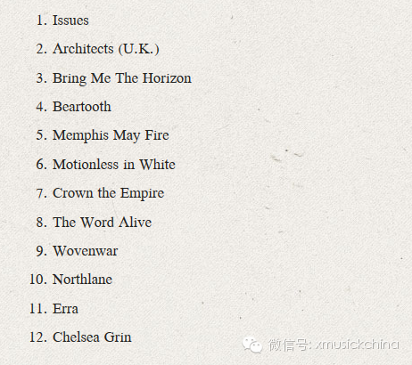 Alternative Press另类摇滚乐杂志经常推荐各种TOP N清单,最新金属核未来之星又出炉了。头三名是 ISSUES、ARCHITECTS、BRING ME THE HORIZON。不过,[思考] MOTIONLESS IN WHITE不是今日之星吗?BMTH的T恤都卖了好几年了……[挖鼻屎]