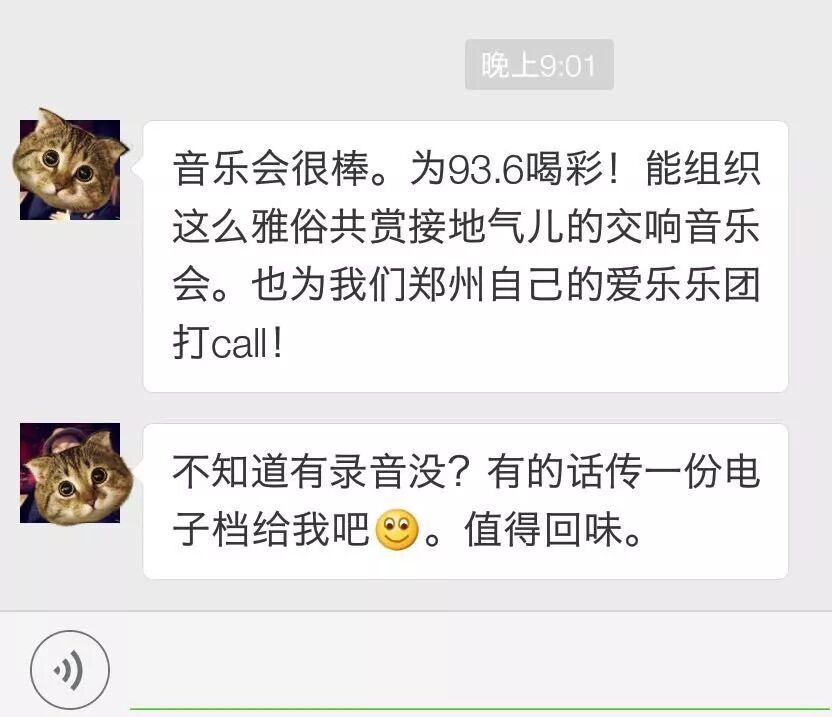 音乐会结束后,936天籁之音在采访现场观众时,遇见了听众蒋先生。原来,蒋先生差点错失这场对他来说有着特殊意义的音乐会!他是在驾车时听到“新年音乐会抢票公告”的,虽立即参与抢票,可惜迟了一步,门票已经全部送出。但蒋先生依然期待着奇迹发生,他不断通过936微信公众号联系小编,并说出了自己迫切需要门票的理由: