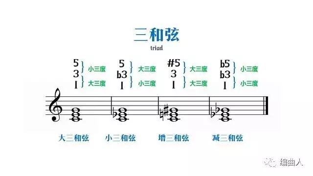 分别是大三和弦,小三和弦,增三和弦,减三和弦。
