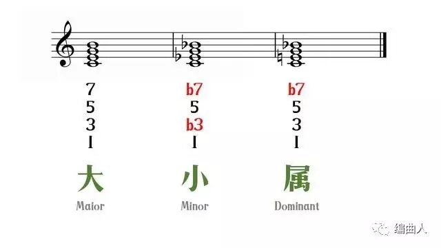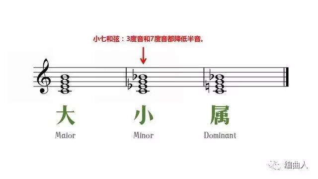 得到一个大七和弦之后,你只要把第三个音跟第七个音都降低半音就可以得到一个小七和弦。
