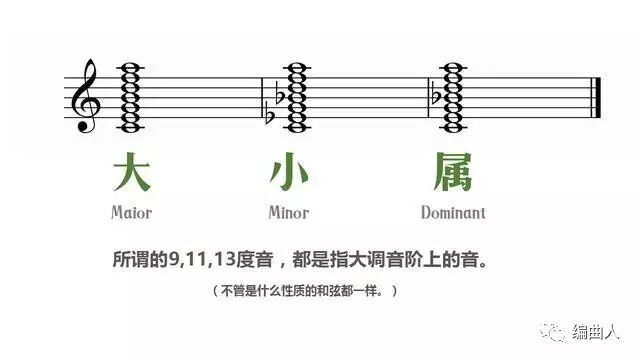 不管是哪种家族的和弦,上面加的9,11,13度音,都是指大调音阶上的音。