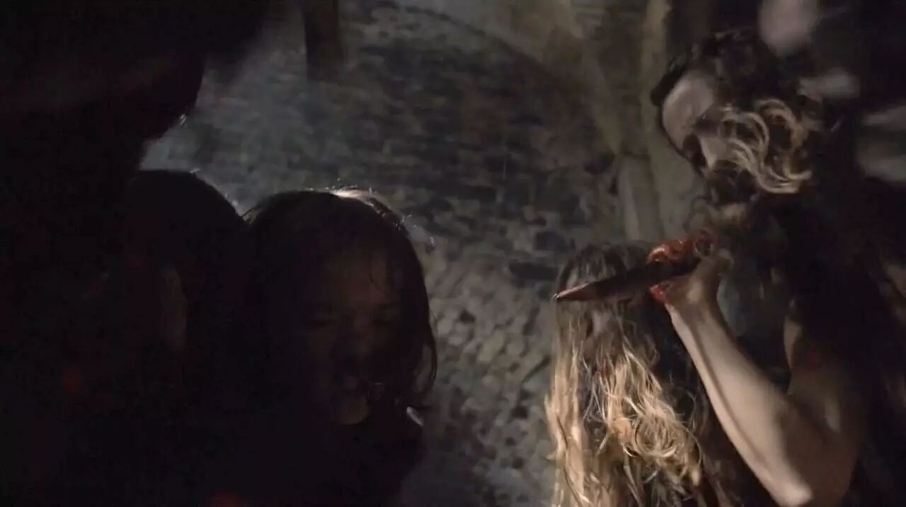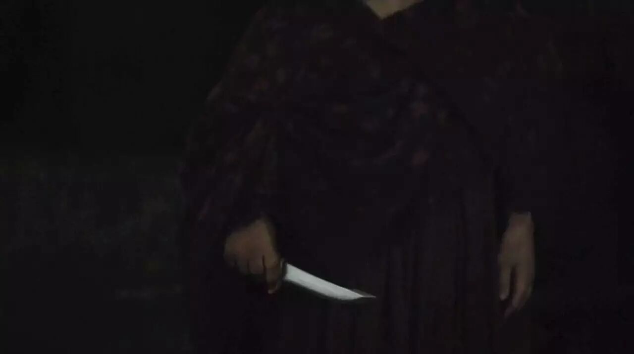 当镜头转向拿着匕首的孩子们出现在大学士身后的一瞬间,童声重唱立刻切入,只是这童声并不如往日我们听到的那样纯洁、明亮,伴随着钢琴唱出的小二度、减二度下行音程,更像是鬼魅地哀嚎和哭泣。