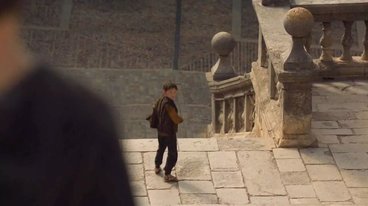 兰塞尔出去押解瑟曦时给了这个小孩儿的背影,同之前那个在大学士耳边低语的女孩儿一起引出后面的重要场面,同时,也引入了后面音乐中的重要元素。