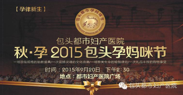 秋天,孕育希望的季节,9月20日,包头都市妇产医院举办秋·韵 2015包头孕妈咪节孕律新生·胎教祈福音乐会,现场举办【韵律新生·胎教祈福音乐会】,为孕妈妈及宝宝们祈福。还有【历史锐变·古今孕育文化展】200件图片及实物展览,解密历代生育文化、【备孕天使·孕婴用品展销会】数千件品牌母婴用品展销,全市最低折扣,更多精彩,不容错过。