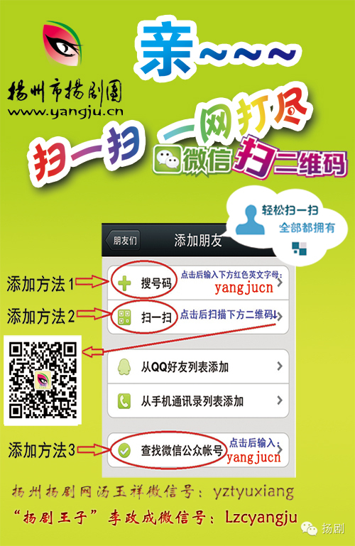 1、打开微信->添加好友->查找公众号->输入"yangjucn"->或搜索->扬剧->点击关注;