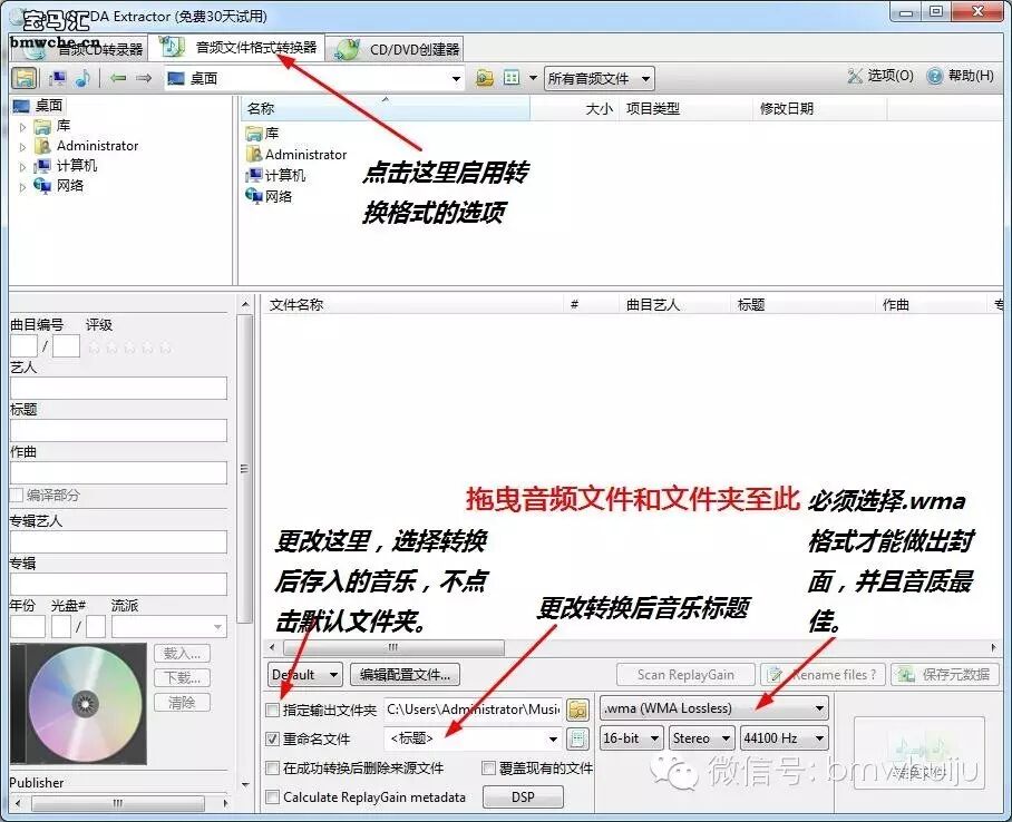 当然还能修改歌曲里面的信息,例如:作者,专辑名,歌曲名,曲风等等。但是网上能下载到的无损格式大多为WAV、FLAC和APE的,几乎不大有WMA的,那么就需要用到格式转换软件了,强烈推荐Easy CD-DA Extractor(本页有下载地址),使用非常方便简单。