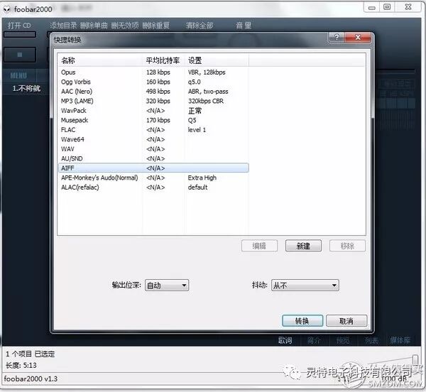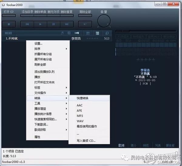 最后,小灵跟大家分享一下各种音频格式之间的互相转换(PS:如果是有损压缩转换成“无损格式”结果音频也不是无损音源,而是被压缩过后的“无损封装”),音乐格式之间转换的软件很多,这里小灵推荐一个最实用的而且是免费的音乐播放器软件foobar2000,这也是整个音频播放领域最强大(没有之一)的软件,没有之一。操作也很简单,打开foobar2000,添加需要转换的歌曲,全选或单独选中,鼠标右击,选择转换--快捷转换,如下图: