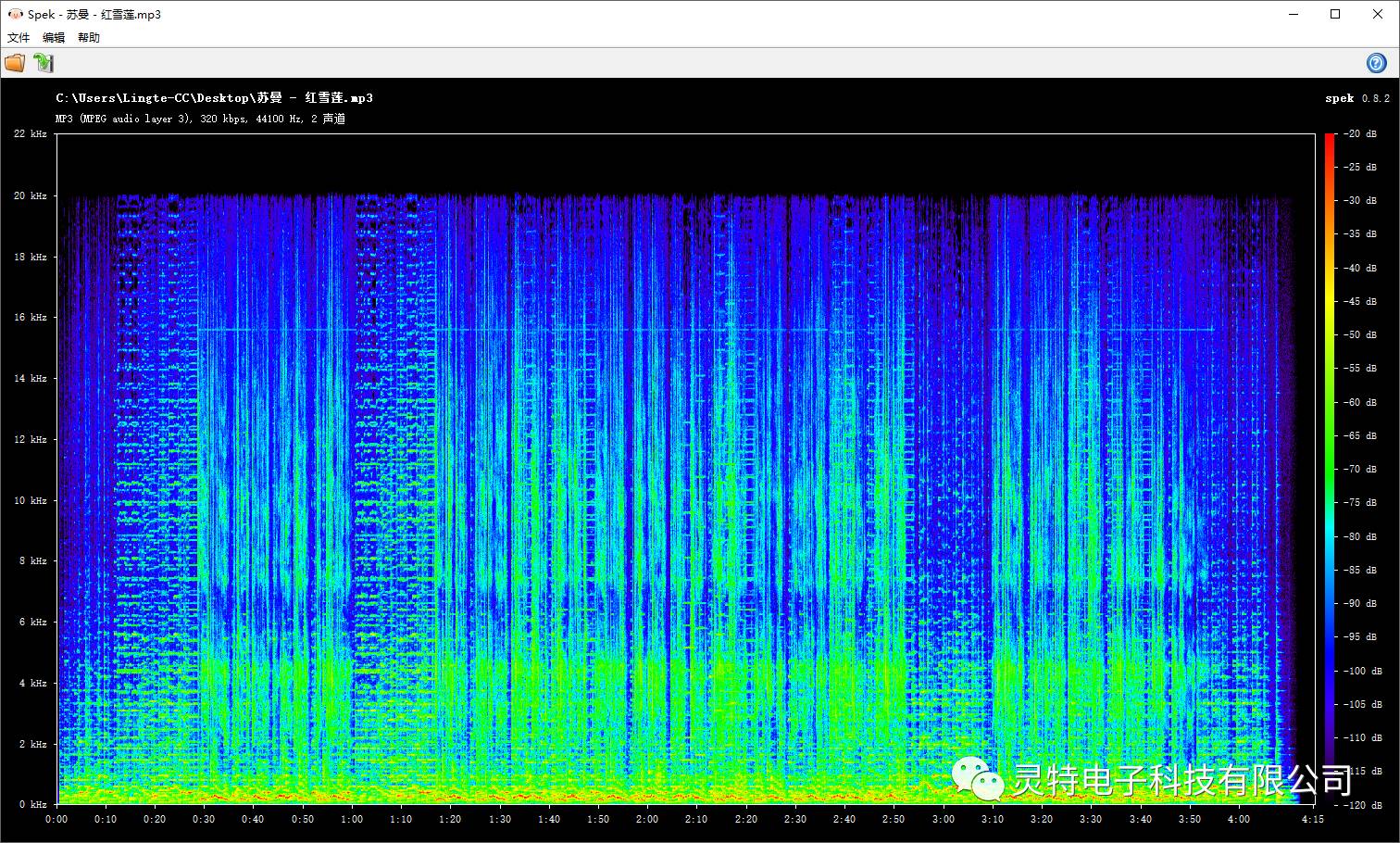 而假的无损最顶端肯定都是一刀切的,因为假无损大多数是由320kbps的mp3转来的,显示的光谱最高只能去到20000Hz,即使将MP3格式再转换为无损格式,光谱也是不会改变的,如下图: