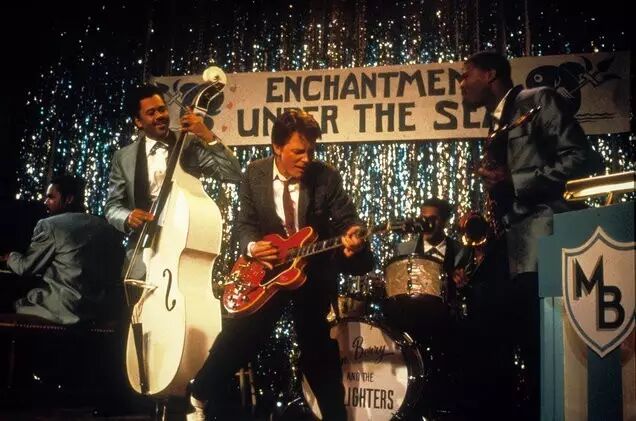 1985年的经典科幻电影祭出了最会加戏的致敬梗。从1985年穿越回1955年的故事主人公马丁在舞会上表演了三年后才发行的Johnny B. Goode,金属solo一出震惊全场,还有经典的鸭子舞步。导演还特别设置了在现场的Chuck表哥这一角色,打电话给Chuck,“你听这个,不就是你一直在寻找的吗?!”233333