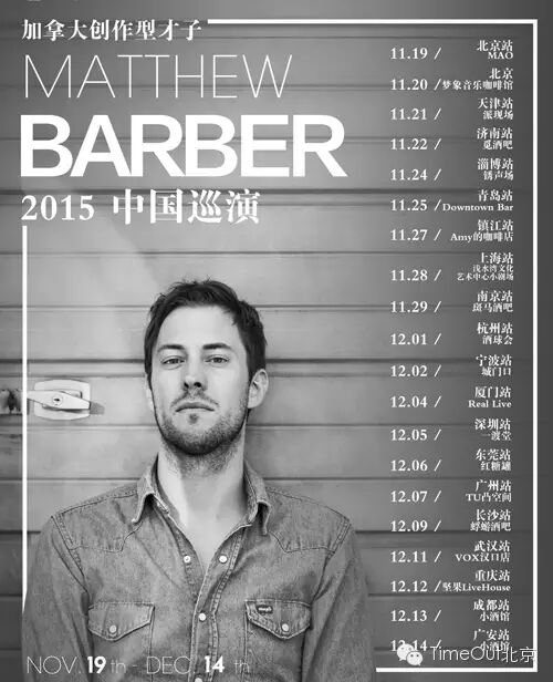 Matthew Barber2015中国巡演北京站,11月19日,MAO livehouse,票价:预售60元、现场80元