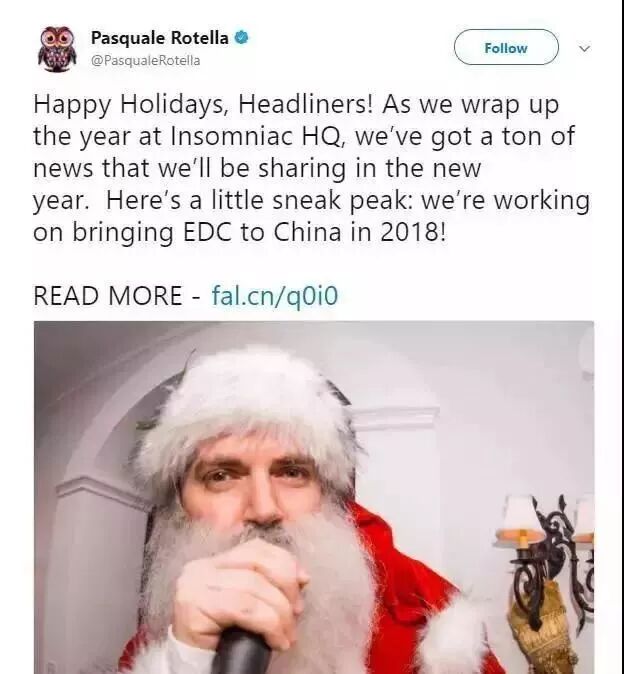 作为电音节的鼻祖,EDC电音节成立二十多年以来,已拓展到美国加州,科罗拉多,佛罗里达,伊利诺伊州,内华达州,新泽西,纽约,得克萨斯,波多黎各以及墨西哥,英国,巴西和日本。北京时间12月22号7点,美国大型电子音乐节Edc创始人兼CEO Rotella先生在社交平台上分享圣诞节日问候,并公布了要在2018新的一年将EDC带到中国的消息。