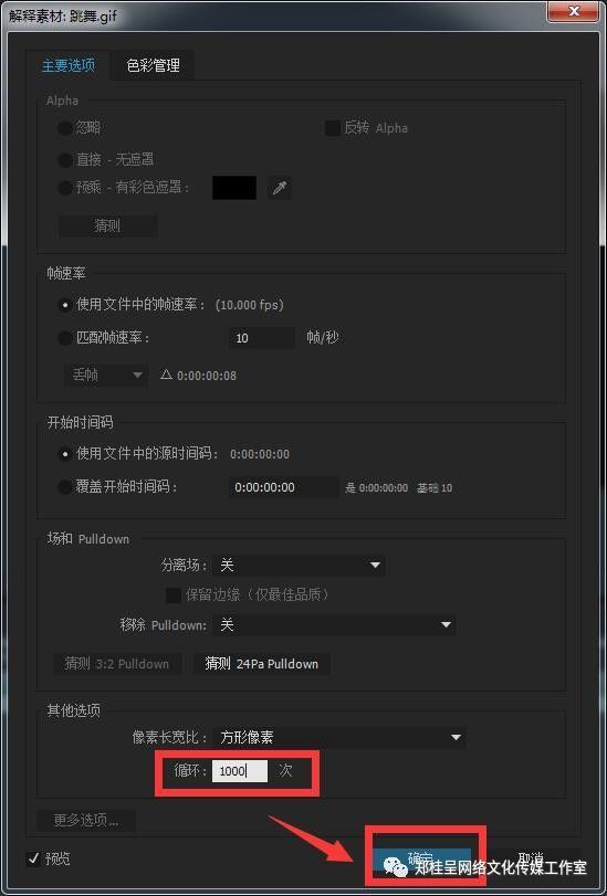 弹出的对话窗口中,将循环次数修改成1000左右,意思就是将整个动画文件的播放时间重复1000次,因为播放一次的时间非常短,而我们的音乐是较长时间的,所以我们要做这个设置,将动画文件和音乐文件的时间完全重叠