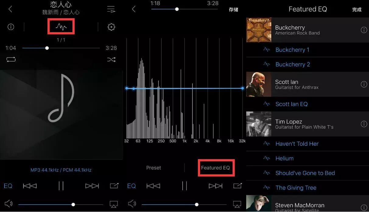 播放时,也可调整 Featured EQ ,内置提供了18组音乐家所推荐的音频曲线,直接让我们可方便套用,当然也可以通过手指自订调整音频曲线。