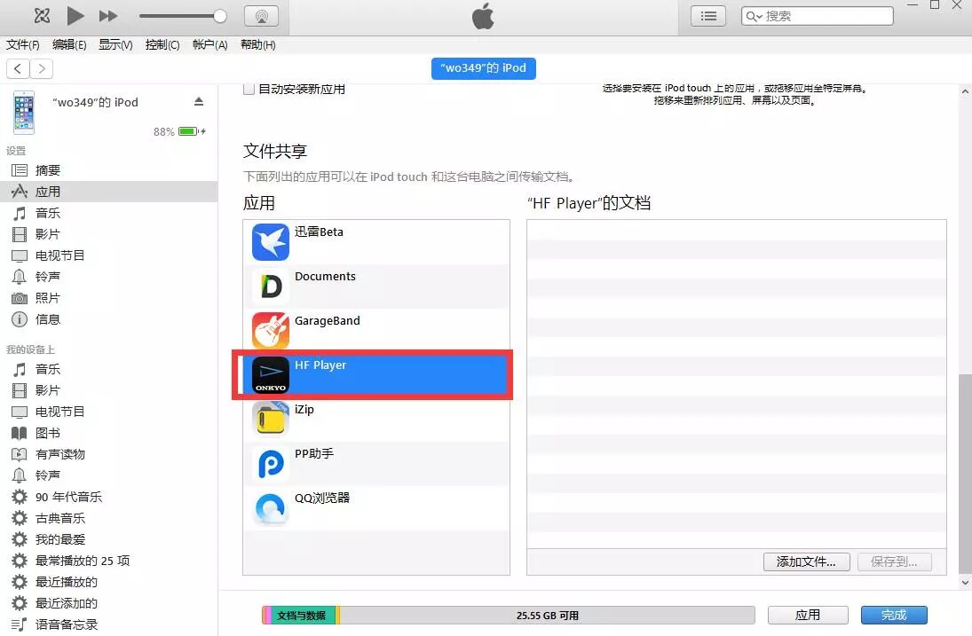 通过 iTunes 点选 iPhone 、 iPad 设备图,从左侧应用选项中选择「文件共享」。