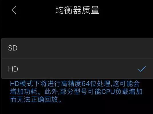 均衡器质量调整预设为 SD ,另还有 HD 可以选择,建议调整为 HD 模式,仅只有 iPhone 5s、iPad Air以上 A7 处理器才可使用。
