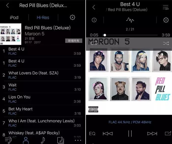 DSD 11.2 MHz及更高取样速率只能在iPhone 5s或更高型号设备上播放,HD曲库不支持MP3格式。