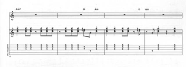 这首曲子是旋律小调,它和我们上次讲的那首Funk实际上是一模一样的,和声是Am和D属七,我们第一节课先把这首曲子里的几个重要节奏讲清楚。