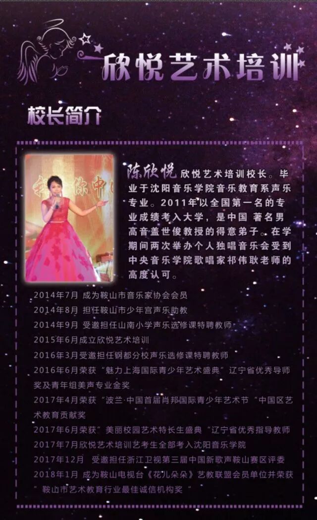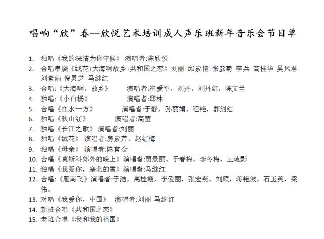 欣悦艺术培训成人班成立于2017年3月,开设声乐班,古筝班,葫芦丝班等专业。丰富中老年人业余生活,圆其年轻时代的音乐梦。每年有机会参加各种演出及电视台活动。