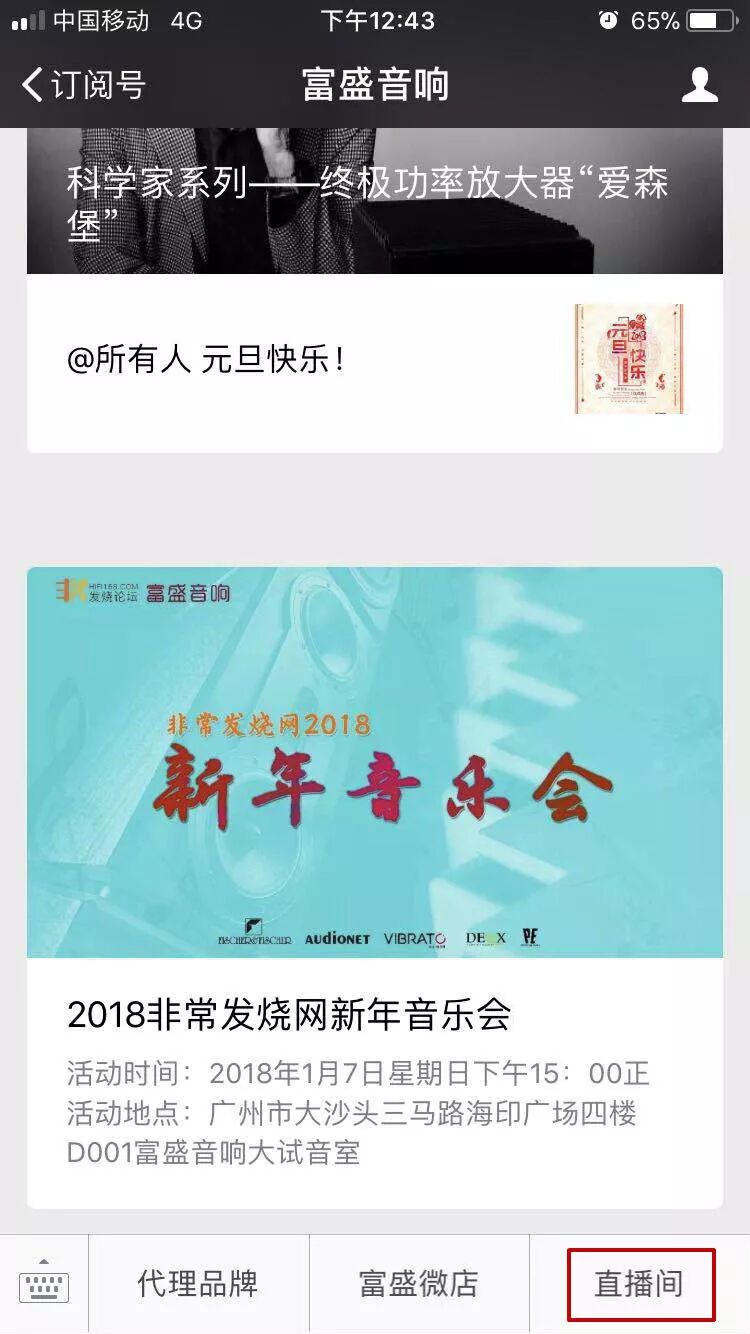 发烧友可以关注富盛音响公众号网上看直播: