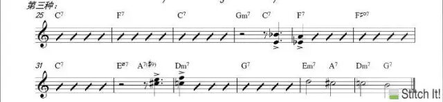 谱例上的是第三种和弦进行,第三种是在演奏blues的时候最常用到的。它前3小节与之前说的第一、第二种都是一样,在第4小节的1、2拍加了一个5级minor7,在爵士乐中如果一个属和弦长时间停留可以把它吹成2-5,这个也是一样。