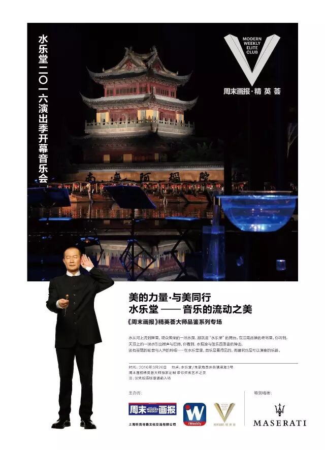 2016年3月26日,【周末画报•精英荟】在上海朱家角西井街漕港滩3号的水乐堂携手著名音乐家、指挥家谭盾先生以“美的力量·与美同行”为题,为大家带来一场精彩的音乐流动之美体验,本场演出也是水乐堂2016演出季的开幕音乐会。