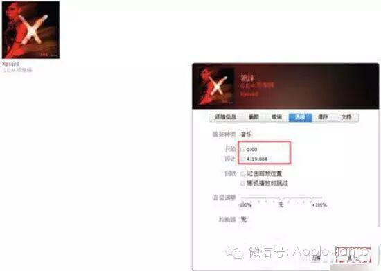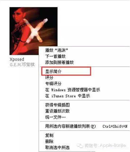 第四步,算好时间以后,【右键】点击歌曲,选择【显示简介】选项。在显示简介内选择【选项】,设置好刚才记住的想要设置为铃声部分的起始时间,点击【确定】。