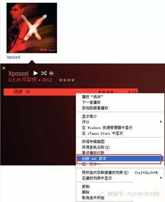 第五步,完成后,再次【右键】点击歌曲,在下拉菜单中,选择【创建AAC版本】。