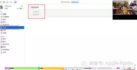 第九步,随后,在iTunes中作则选择【铃声】,点击【同步铃声】,选择完毕后,点击右下角的【应用】。