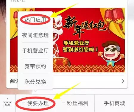 进入丹东移动微信,依次点击底部按钮【我要办理】→【热门应用】;